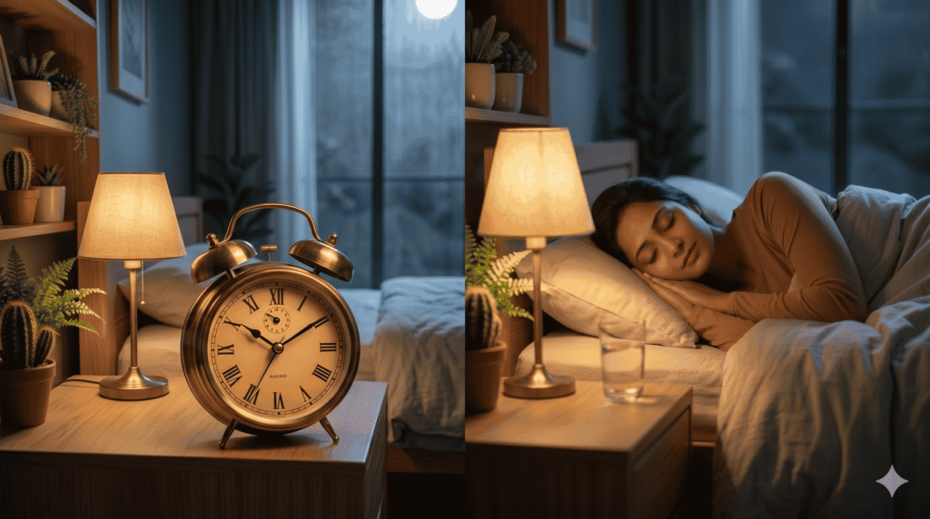 How to do it quickly: Bedroom mein andhera rakhein (Dark curtains use karein). Agar shor hai toh ‘White Noise’ ya halka sukoon bhara music sunein.
